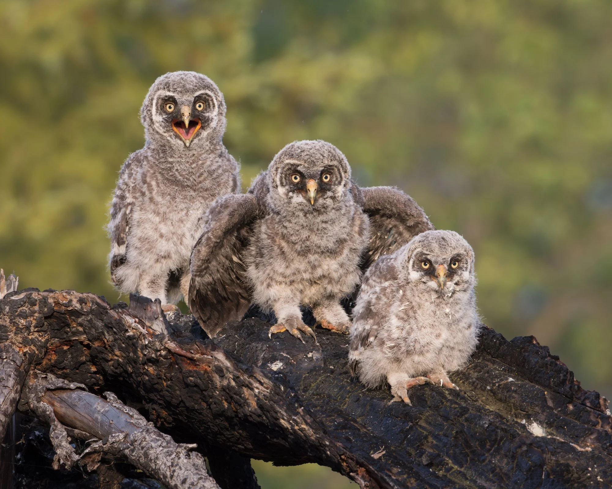 Just hours away from fledging, a trio of Great Grey Owl nestlings impatiently await the next prey delivery from their nest atop a burnt out spruce snag. Photographed in British Columbia’s Central Interior.